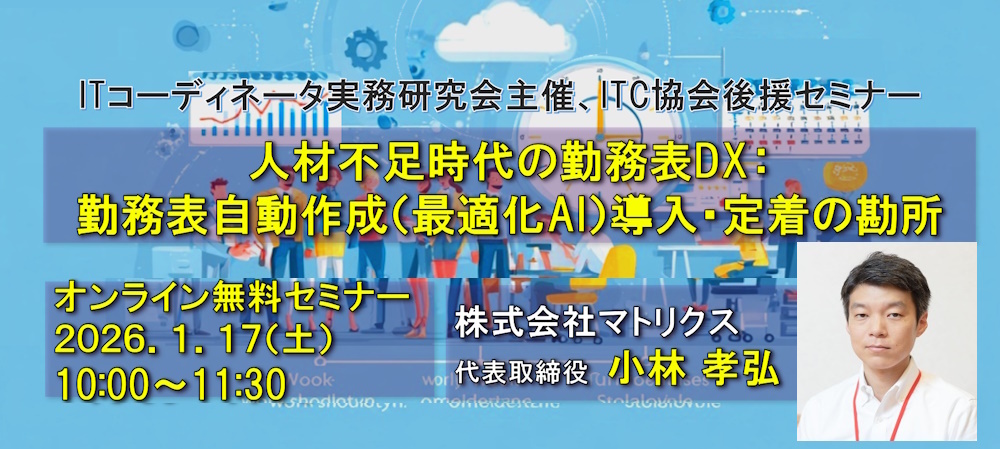 このセミナーはITコーディネータ実務研究会主催、ITC協会後援のセミナーとなります。